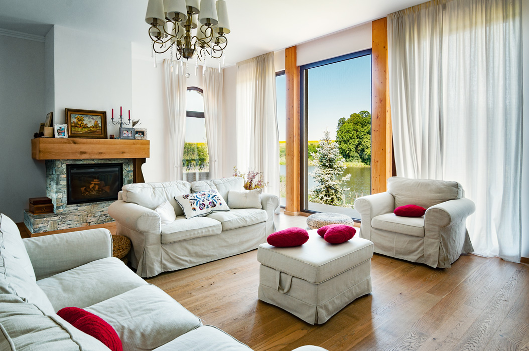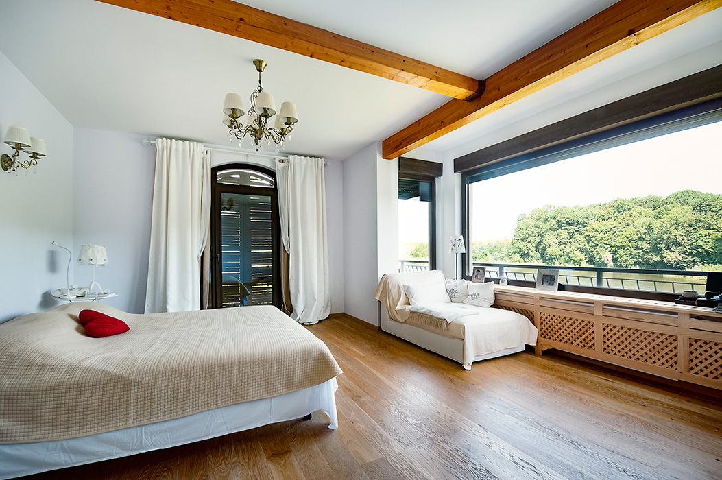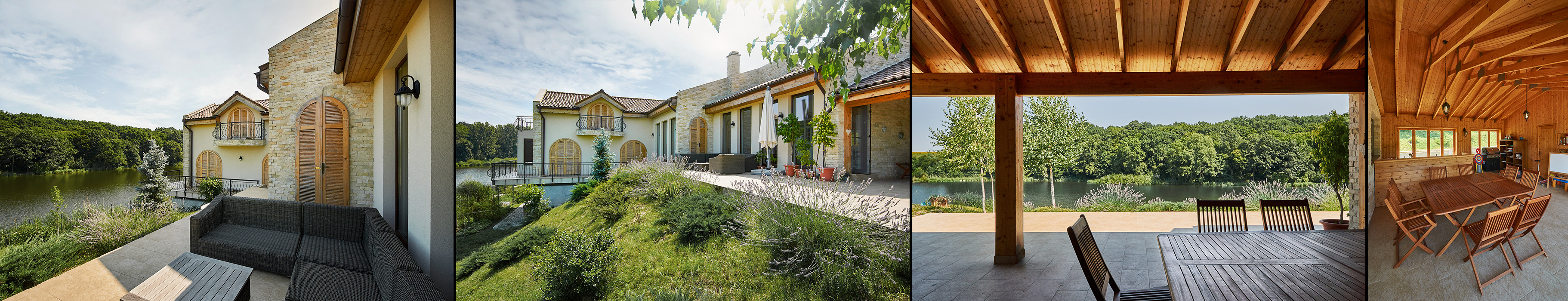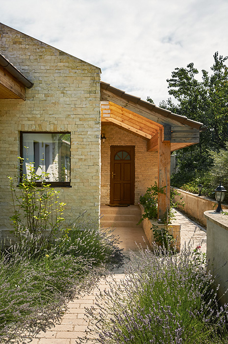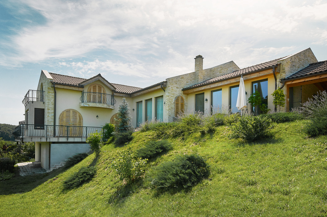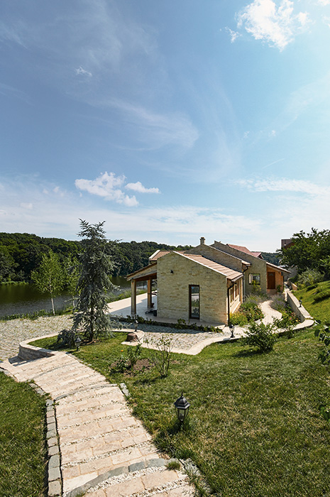 We managed to do so by using large glass areas towards the lake, by laying the house properly on the sloped ground and by the use of materials. Because we didn't want to interfere with the all-natural vibe of the surroundings, we preferred using all-natural materials: wood as a structural material as well as an interior and exterior wall finishing, natural stone on both façades and pavements, ceramic roofing.