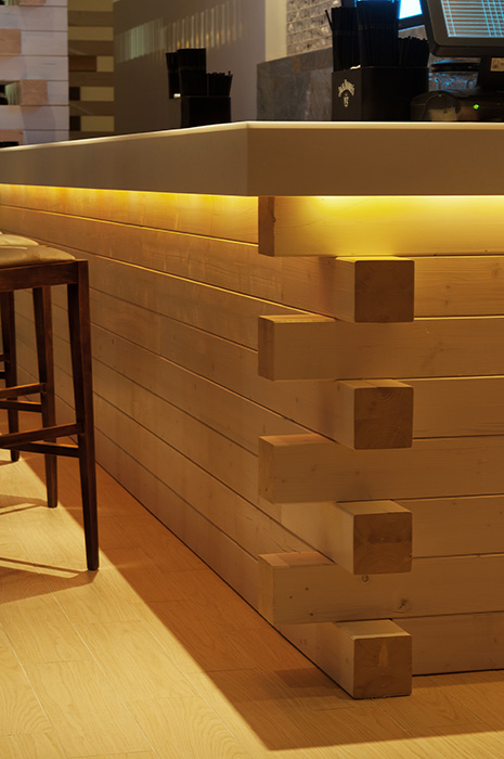 Besides the aesthetic and structural aspects, the bar had to have high functionality. Therefore, choosing HI-MACS was an easy decision, as it has a number of features that make it the most suitable material for restaurants: it is deeply ecologic, very easy to maintain, highly resistant to mechanical and chemical action, allows seamless joints, it can be three-dimensionally moulded and has translucency properties.
