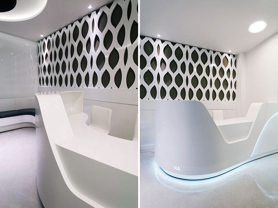 To give spaciousness to a small room, the vertical front of the reception is continued with a lateral cladding also made of HI-MACS® Alpine White. The painted MDF wall behind the desk is CNC processed with an elliptical shape pattern.